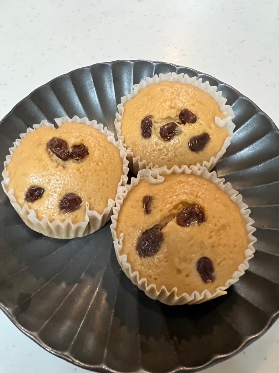 ③ 耐熱性の型にグラシンカップ敷き、生地を均等に分け入れ、レーズンを散らす。