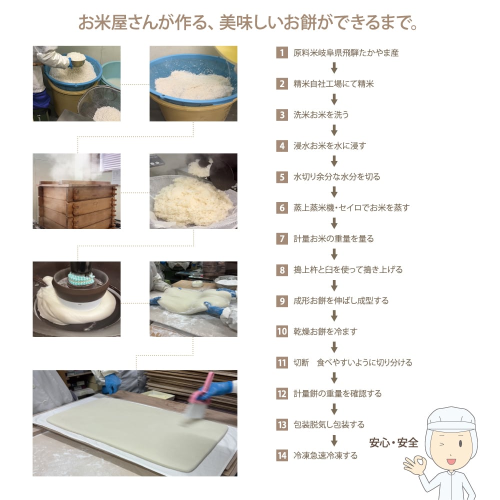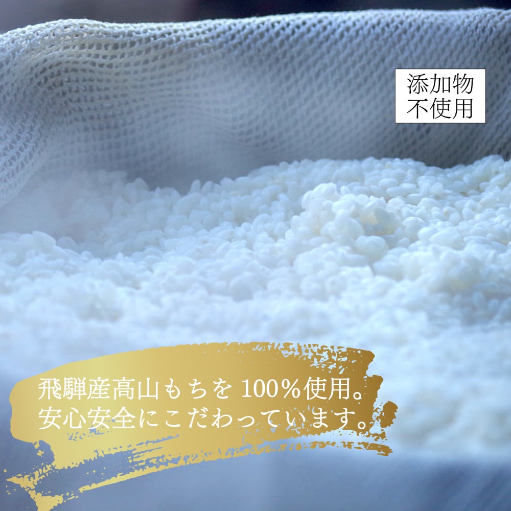 たかやまもちは、岐阜県高山市で丹精込めて育てられたもち米。米の品質が高く、モチモチとした食感と自然な甘みが特徴です。このもち米の特性を最大限に活かし、職人の手で心を込めてつきあげました。新鮮なつきたての味を急速冷凍することで、家庭でも簡単に楽しめます。