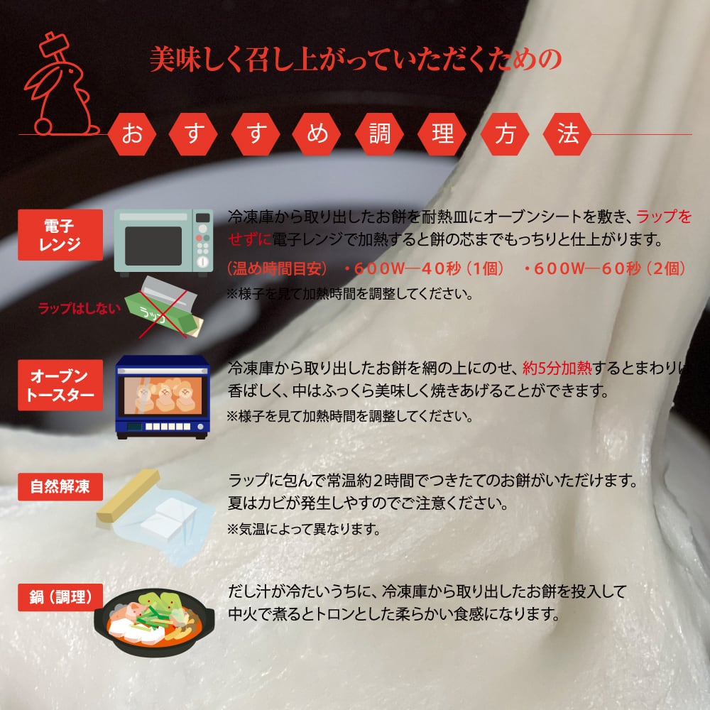 急速冷凍されたおかげ餅は、冷凍庫で保管して解凍後なるべく早くお召し上がりください。