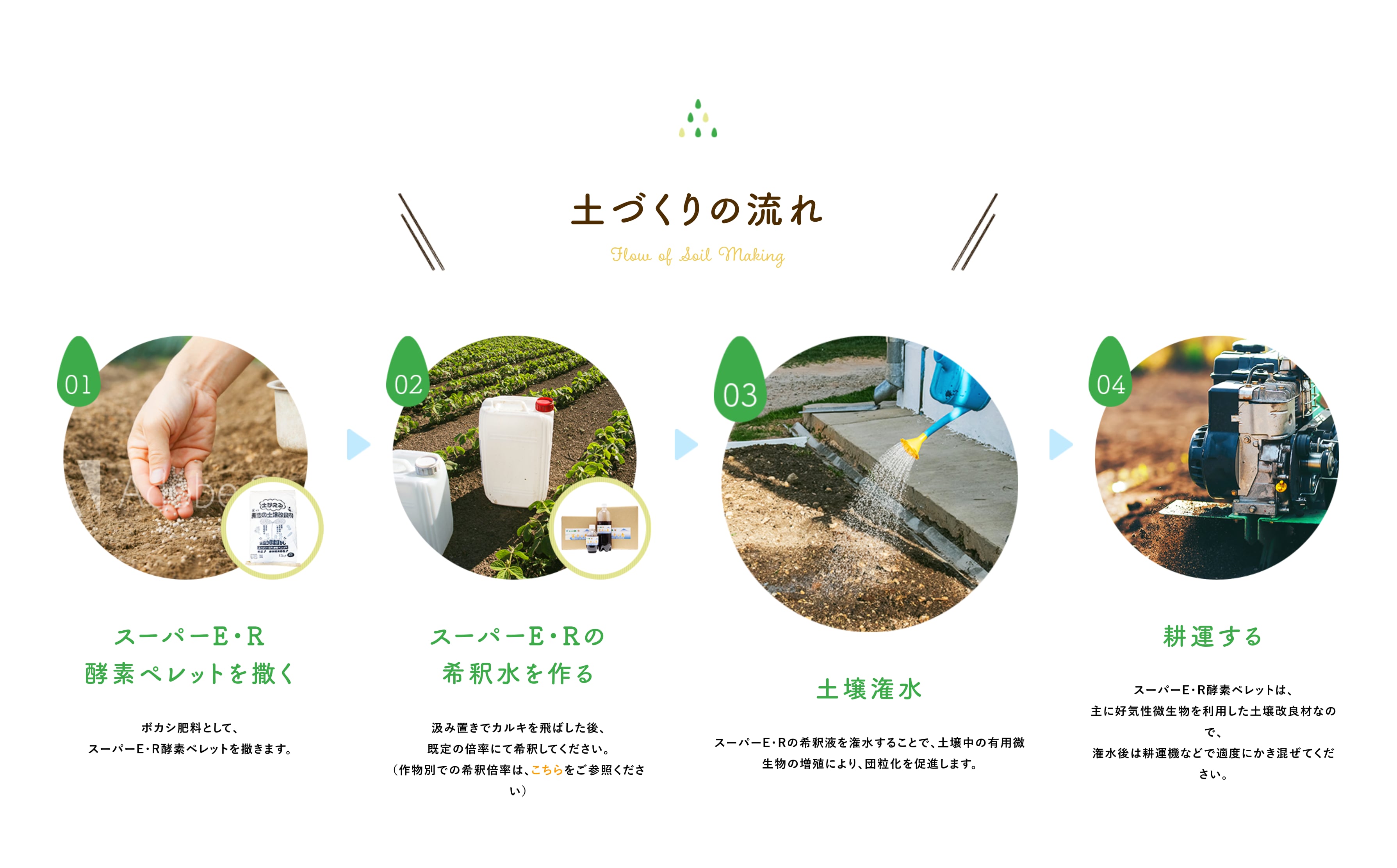 スーパーE・Rは、「活きた微生物」を用い、微生物と酵素を活性化した土壌改良材で、
